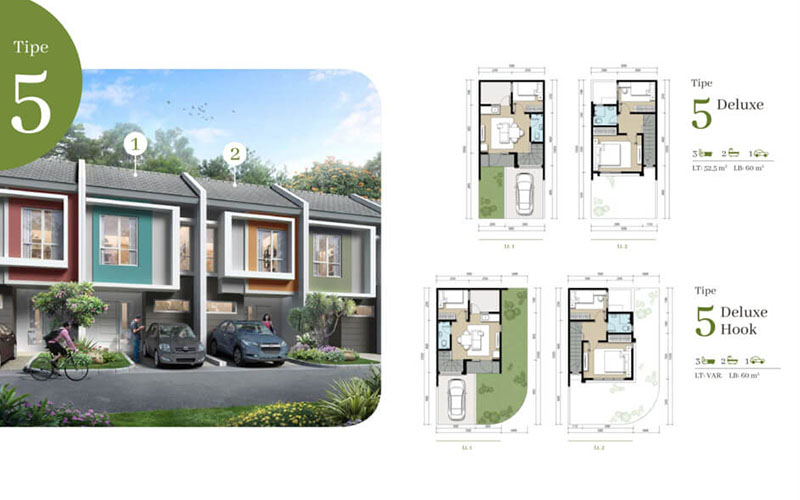 - TIPE LEBAR 5, Luas tanah 5 x 10,5, Luas bangunan 60 m2 (deluxe), Harga mulai 1,080 Milyar-an