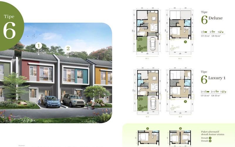 - TIPE LEBAR 6, Luas tanah 6 x 12, Luas bangunan 69 m2 (deluxe) atau 77 m2 (luxury), harga mulai 1,4 Milyar-an